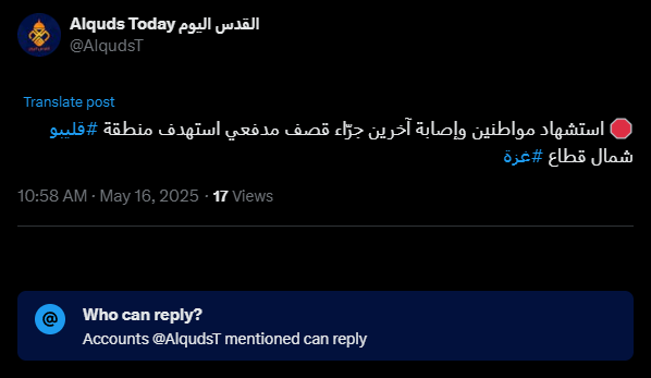 استشهاد مواطنين وإصابة آخرين جرّاء قصف مدفعي استهدف منطقة #قليبو شمال قطاع #غزة