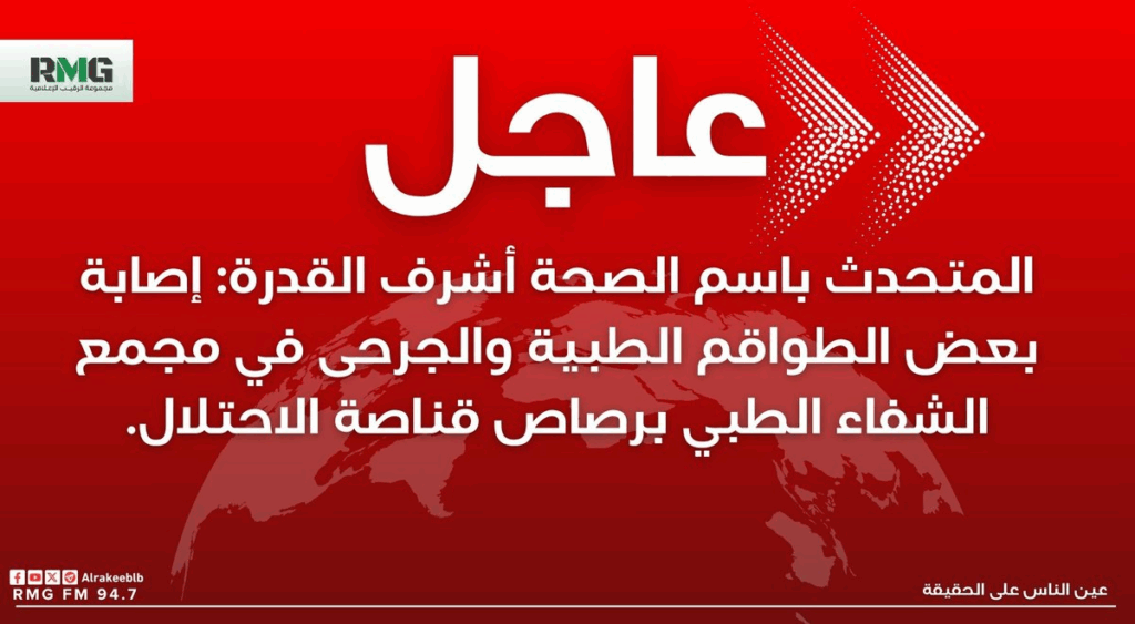 المتحدث باسم الصحة أشرف القدرة: "إصابة بعض الطواقم الطبية والجرحى في مجمع الشفاء الطبي برصاص قناصة الاحتلال".