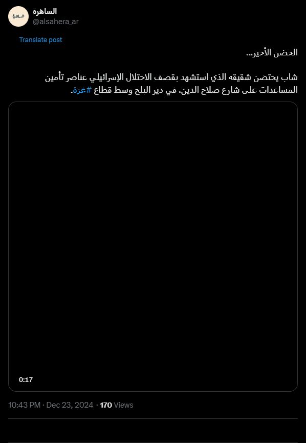 شاب يحتضن شقيقه الذي استشهد بقصف الاحتلال الإسرائيلي عناصر تأمين المساعدات على شارع صلاح الدين، في دير البلح وسط قطاع #غزة.