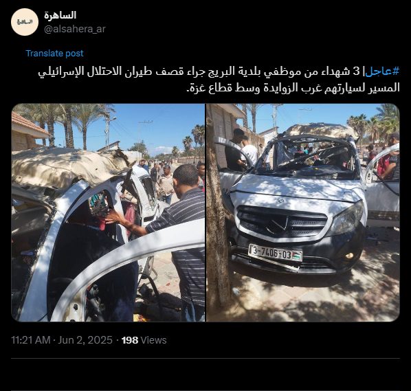 #Urgent | 3 Al-Bureij municipality employees were martyred when Israeli drones bombed their car west of Al-Zawayda in the central Gaza Strip.