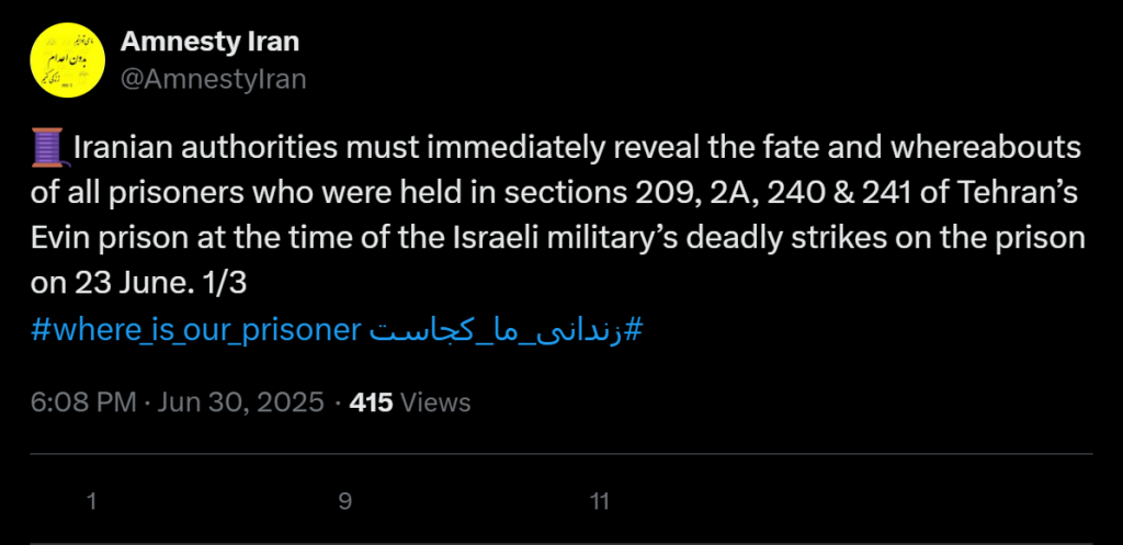 Iranian authorities must immediately reveal the fate and whereabouts of all prisoners who were held in sections 209, 2A, 240 & 241 of Tehran’s Evin prison at the time of the Israeli military’s deadly strikes on the prison on 23 June. 1/3