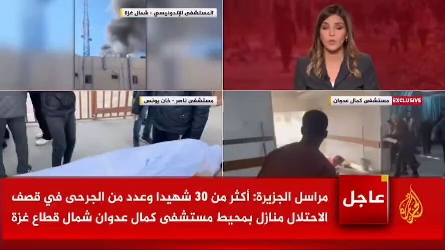 Dozens of martyrs and wounded in Israeli shelling of homes surrounding Kamal Adwan Hospital in the northern #Gaza Strip. Occupation forces storm the hospital and force medical staff, patients and the wounded to leave. #AlJazeera correspondent Anas Al-Sharif monitors developments on the scene. #Gaza_War #News
