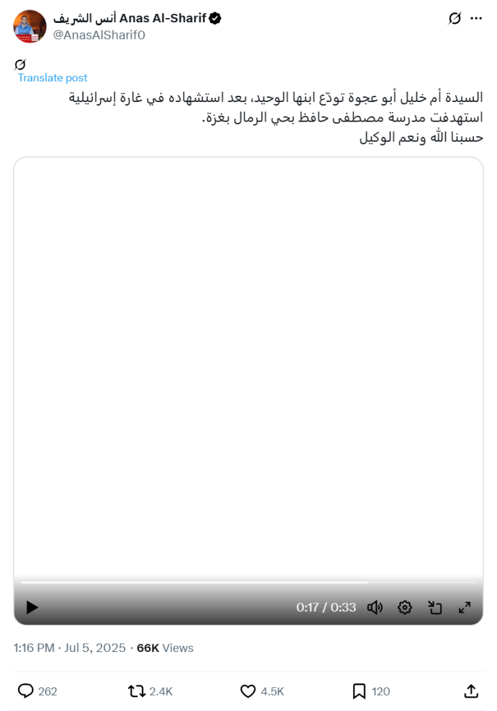 Mrs. Umm Khalil Abu Ajwa bids farewell to her only son, who was martyred in an Israeli airstrike targeting Mustafa Hafez School in the Rimal neighborhood of Gaza City. God is sufficient for us, and He is the best Disposer of affairs.