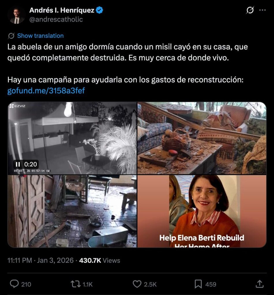 La abuela de un amigo dormía cuando un misil cayó en su casa, que quedó completamente destruida. Es muy cerca de donde vivo.