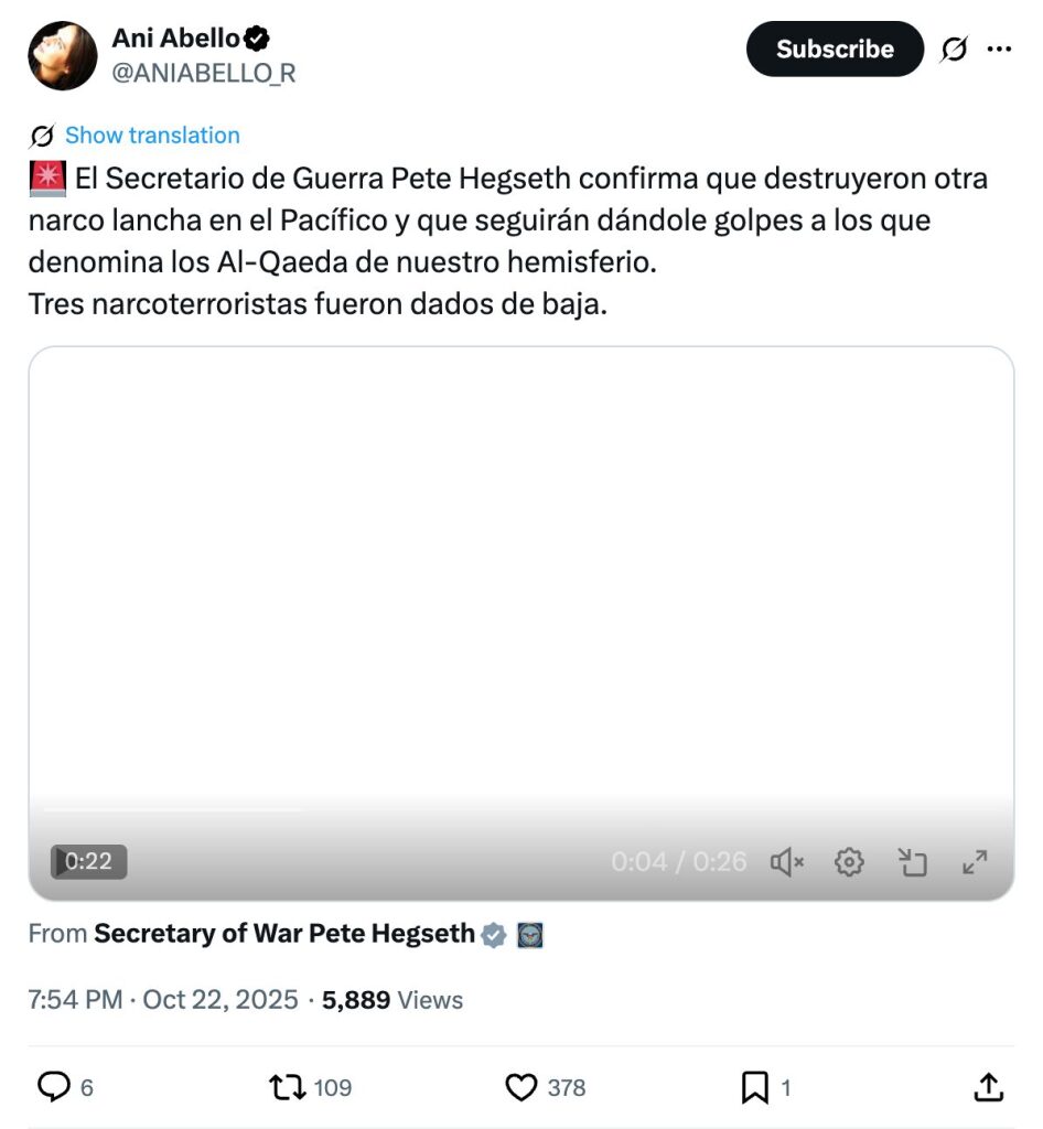 El Secretario de Guerra Pete Hegseth confirma que destruyeron otra narco lancha en el Pacífico y que seguirán dándole golpes a los que denomina los Al-Qaeda de nuestro hemisferio.