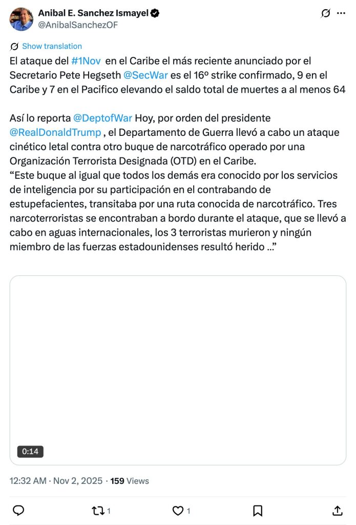 El ataque del #1Nov en el Caribe el más reciente anunciado por el Secretario Pete Hegseth @SecWar es el 16º strike confirmado, 9 en el Caribe y 7 en el Pacifico elevando el saldo total de muertes a al menos 64