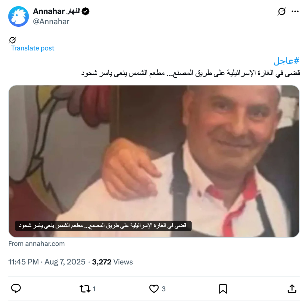 He was killed in the Israeli raid on the Masnaa road... Al Shams Restaurant mourns Yasser Shahoud.