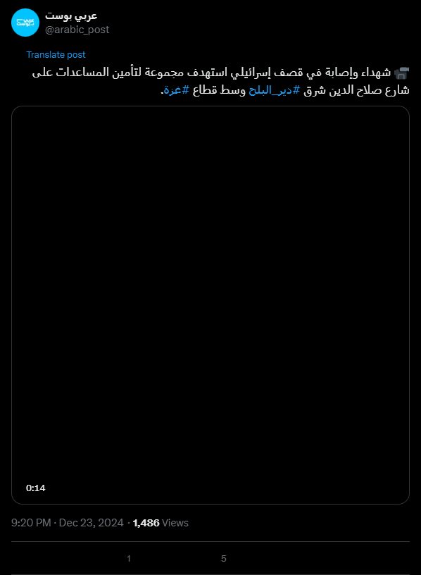شهداء وإصابة في قصف إسرائيلي استهدف مجموعة لتأمين المساعدات على شارع صلاح الدين شرق #دير_البلح وسط قطاع #غزة.
