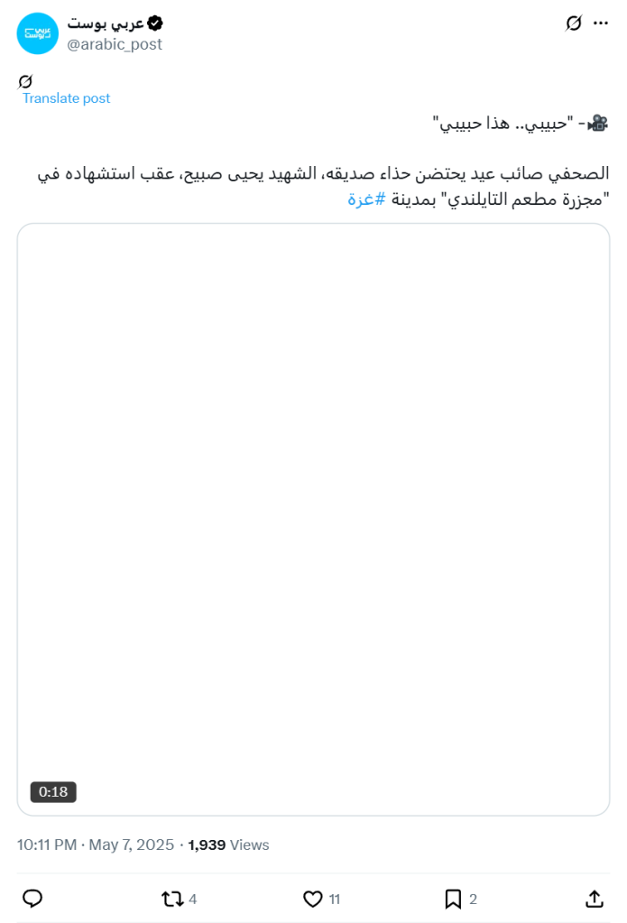 الصحفي صائب عيد يحتضن حذاء صديقه، الشهيد يحيى صبيح، عقب استشهاده في "مجزرة مطعم التايلندي" بمدينة #غزة
