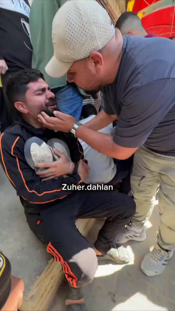 Journalist Saeb Eid hugs the shoes of his friend, martyr Yahya Subaih, after his martyrdom in the "Thai Restaurant Massacre" in #Gaza City.