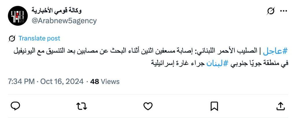 #Urgent | Lebanese Red Cross: Two paramedics were injured while searching for the wounded, after coordination with UNIFIL, in the Joya area in southern #Lebanon, as a result of an Israeli airstrike.
