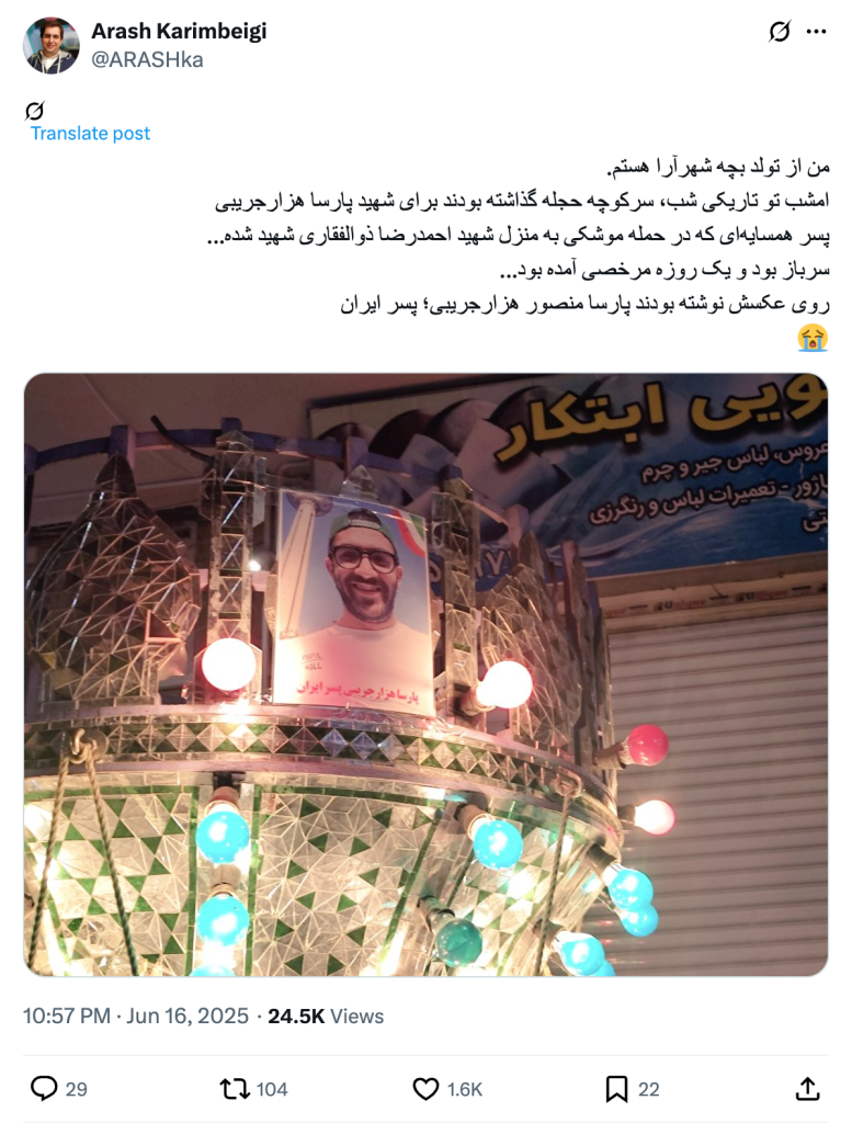 I am a child of Shahr-e-Ara. Tonight, in the darkness of the night, a memorial was laid in the alley for Martyr Parsa Hezar-Jeribi, the son of a neighbor who was martyred in a missile attack on the home of Martyr Ahmad Reza Zolfaghari... He was a soldier and had come on a day's leave... On his photo they wrote: Parsa Mansour Hezar-Jeribi; Son of Iran