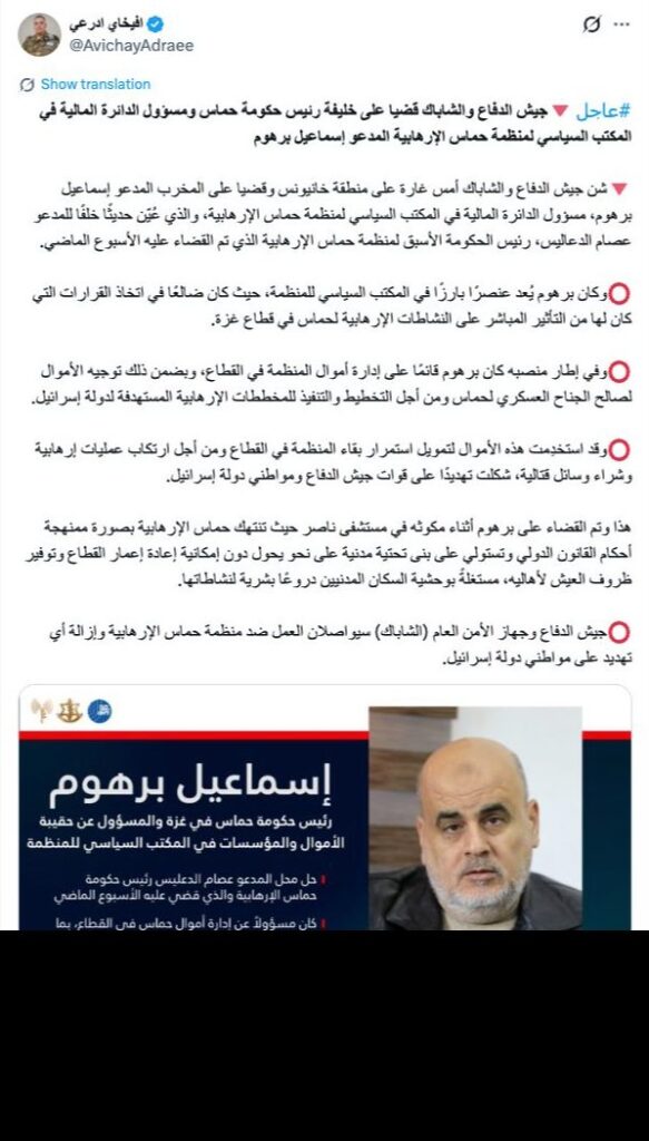 #عاجل جيش الدفاع والشاباك قضيا على خليفة رئيس حكومة حماس ومسؤول الدائرة المالية في المكتب السياسي لمنظمة حماس الإرهابية المدعو إسماعيل برهوم
