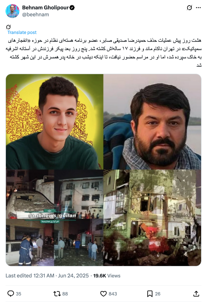 هشت روز پیش عملیات حذف حمیدرضا صدیقی صابر، عضو برنامه هسته‌ای نظام در حوزه «انفجار‌های سمپاتیک» در تهران ناکام ماند و فرزند ۱۷ ساله‌اش کشته شد. پنج روز بعد پیکر فرزندش در آستانه اشرفیه به خاک سپرده شد، اما او در مراسم حضور نیافت، تا اینکه دیشب در خانه پدرهمسرش در این شهر کشته شد