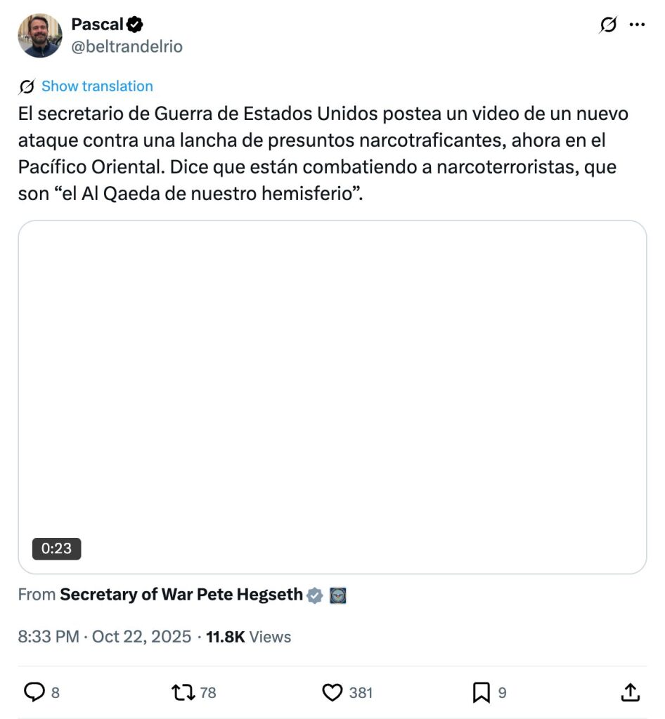 El secretario de Guerra de Estados Unidos postea un video de un nuevo ataque contra una lancha de presuntos narcotraficantes, ahora en el Pacífico Oriental. Dice que están combatiendo a narcoterroristas, que son “el Al Qaeda de nuestro hemisferio”.