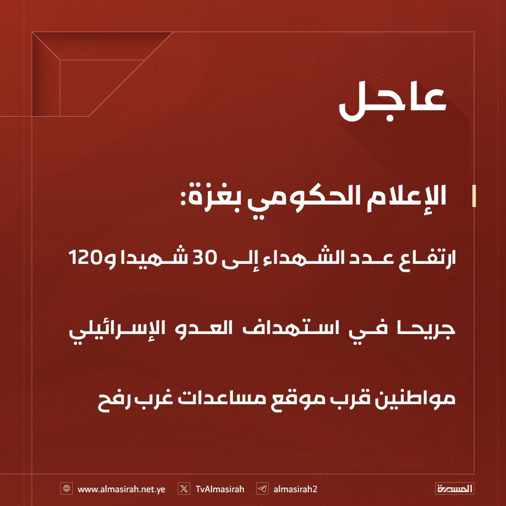 الإعلام الحكومي بـ #غزة: ارتفاع عدد الشهداء إلى 30 شهيدا و120جريحا في استهداف العدو الإسرائيلي مواطنين قرب موقع مساعدات غرب رفح