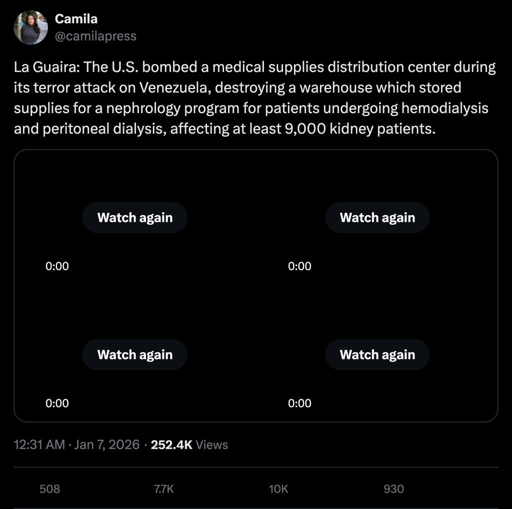 La Guaira: The U.S. bombed a medical supplies distribution center during its terror attack on Venezuela, destroying a warehouse which stored supplies for a nephrology program for patients undergoing hemodialysis and peritoneal dialysis, affecting at least 9,000 kidney patients.