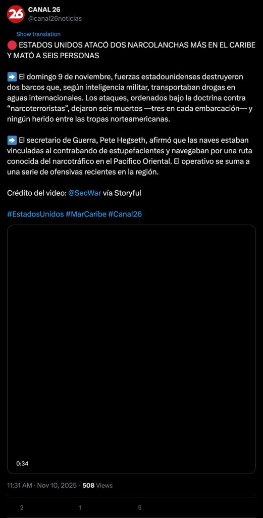 El domingo 9 de noviembre, fuerzas estadounidenses destruyeron dos barcos que, según inteligencia militar, transportaban drogas en aguas internacionales. Los ataques, ordenados bajo la doctrina contra “narcoterroristas”, dejaron seis muertos —tres en cada embarcación— y ningún herido entre las tropas norteamericanas.