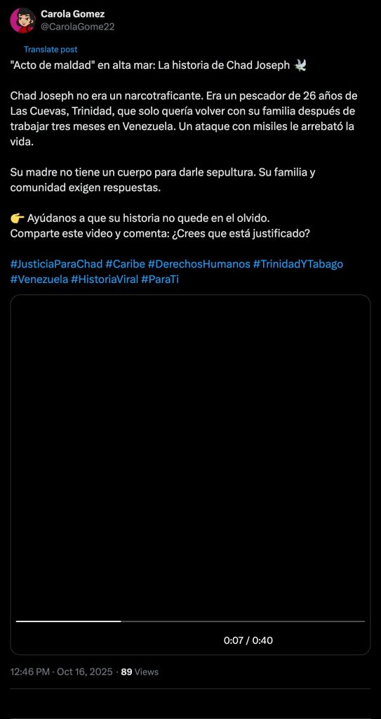 Chad Joseph wasn't a drug trafficker. He was a 26-year-old fisherman from Las Cuevas, Trinidad, who just wanted to return to his family after three months of working in Venezuela. A missile attack took his life.