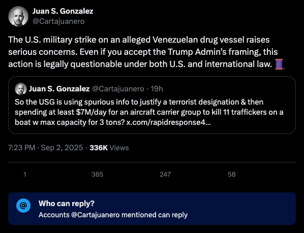 The U.S. military strike on an alleged Venezuelan drug vessel raises serious concerns. Even if you accept the Trump Admin’s framing, this action is legally questionable under both U.S. and international law.