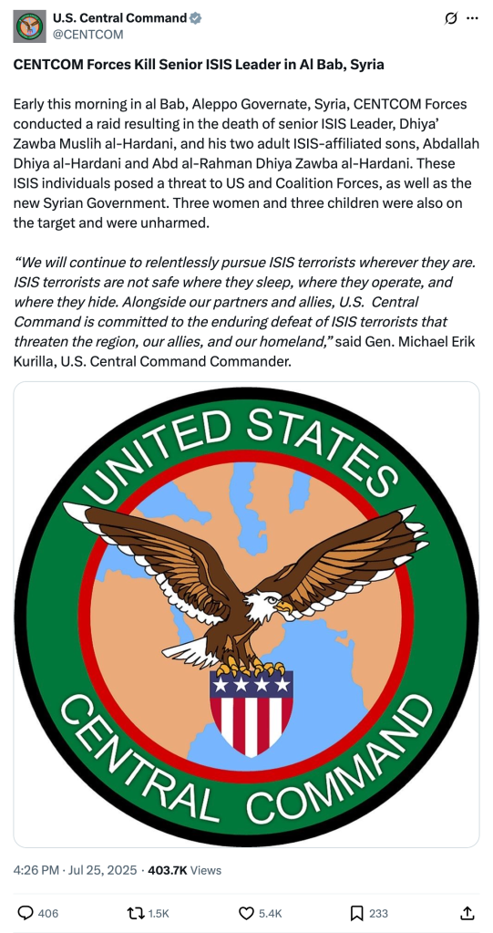 Early this morning in al Bab, Aleppo Governate, Syria, CENTCOM Forces conducted a raid resulting in the death of senior ISIS Leader, Dhiya’ Zawba Muslih al-Hardani, and his two adult ISIS-affiliated sons, Abdallah Dhiya al-Hardani and Abd al-Rahman Dhiya Zawba al-Hardani. These ISIS individuals posed a threat to US and Coalition Forces, as well as the new Syrian Government. Three women and three children were also on the target and were unharmed.