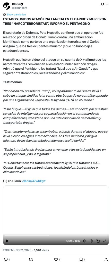 “Por orden del presidente Trump, el Departamento de Guerra llevó a cabo un ataque cinético letal contra otro buque de narcotráfico operado por una Organización Terrorista Designada (OTD) en el Caribe.”