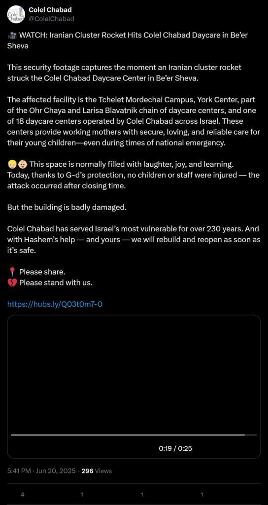 WATCH: Iranian Cluster Rocket Hits Colel Chabad Daycare in Be’er Sheva
