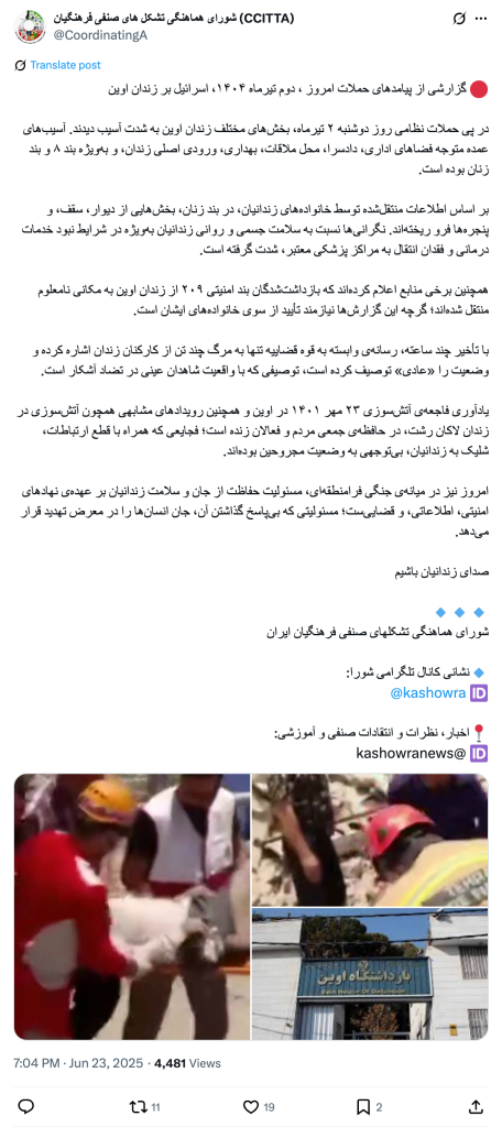 A report on the consequences of today's attacks, June 23, 2025, by Israel on Evin Prison Following the military attacks on Monday, June 23, 2025 various parts of Evin Prison were severely damaged. The main damage was to the administrative spaces, the courthouse, the meeting place, the infirmary, the main entrance to the prison, and especially to Ward 8 and the women's ward. According to information transmitted by the families of the prisoners, parts of the walls, ceiling, and windows in the women's ward have collapsed. Concerns about the physical and mental health of the prisoners have intensified, especially in the absence of medical services and the lack of transfer to reputable medical centers. Some sources have also announced that the detainees in Security Ward 209 of Evin Prison have been transferred to an unknown location; although these reports require confirmation from their families. With a delay of several hours, the media affiliated with the judiciary only mentioned the deaths of several prison staff and described the situation as "normal," a description that is in clear contradiction to the reality of eyewitnesses. The memory of the fire disaster of 23 Mehr 1402 in Evin, as well as similar events such as the fire in Lakan Prison in Rasht, is alive in the collective memory of the people and activists; tragedies that were accompanied by the disruption of communications, the shooting of prisoners, and the neglect of the condition of the injured. Today, in the midst of a trans-regional war, the responsibility for protecting the lives and health of prisoners lies with the security, intelligence, and judicial institutions; a responsibility that, if left unanswered, puts human lives at risk. Be the Voice of the Prisoners Coordinating Council of Iranian Teachers’ Trade Associations Telegram Channel Address: @kashowra Union and Educational News, Comments, and Criticisms: @kashowranews