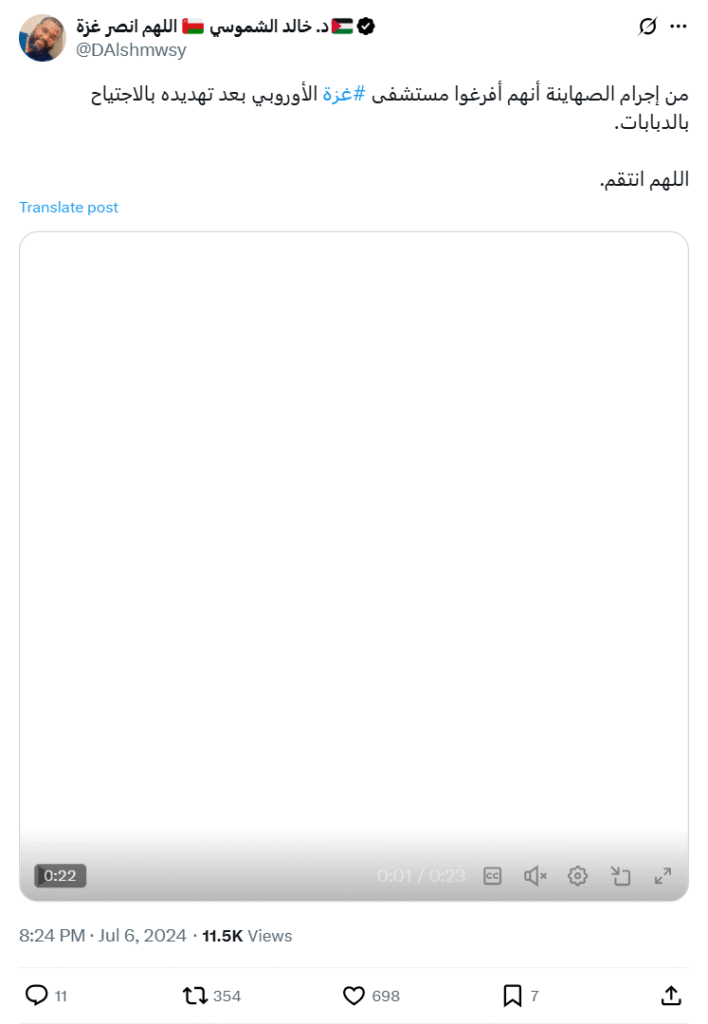 One of the Zionists' crimes is that they emptied the #Gaza European Hospital after threatening to invade it with tanks. Oh God, take revenge.