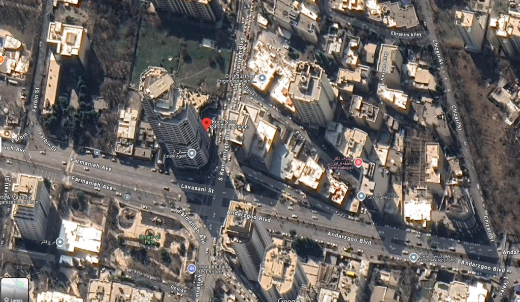 Damage visible on two tower blocks in Farmanieh in north Tehran after Israeli strikes.