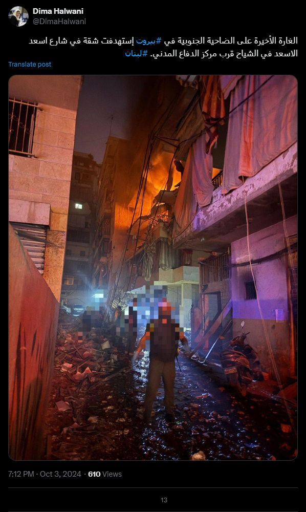 The latest raid on Beirut's southern suburb targeted an apartment on Asaad Al-Asaad Street in Chiyah, near the Civil Defense Center. #Lebanon