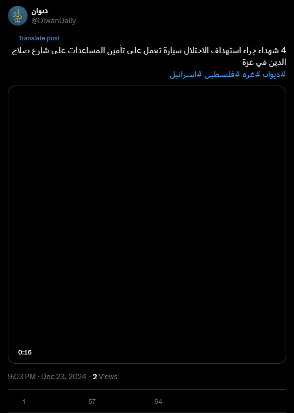 4 martyrs as a result of the occupation targeting a vehicle delivering aid on Salah al-Din Street in Gaza. #Diwan #Gaza #Palestine #Israel