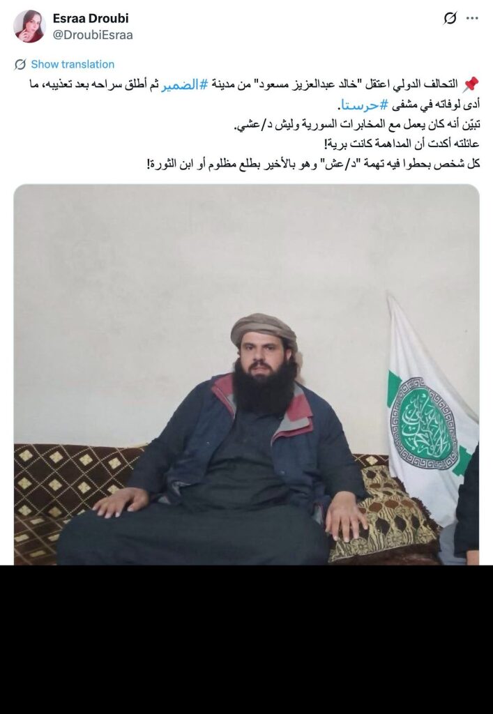 التحالف الدولي اعتقل "خالد عبدالعزيز مسعود" من مدينة #الضمير ثم أطلق سراحه بعد تعذيبه، ما أدى لوفاته في مشفى #حرستا.