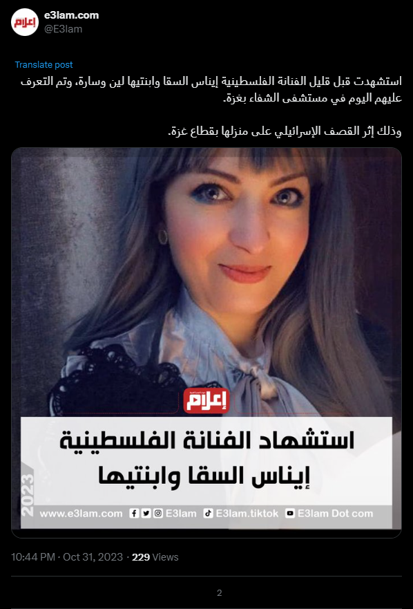 استشهدت قبل قليل الفنانة الفلسطينية إيناس السقا وابنتيها لين وسارة، وتم التعرف عليهم اليوم في مستشفى الشفاء بغزة.