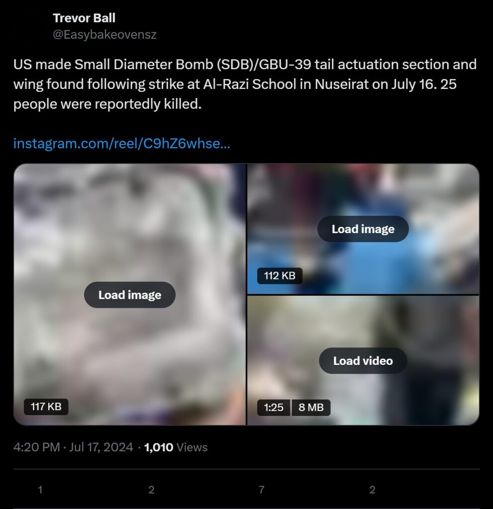 US made Small Diameter Bomb (SDB)/GBU-39 tail actuation section and wing found following strike at Al-Razi School in Nuseirat on July 16. 25 people were reportedly killed.