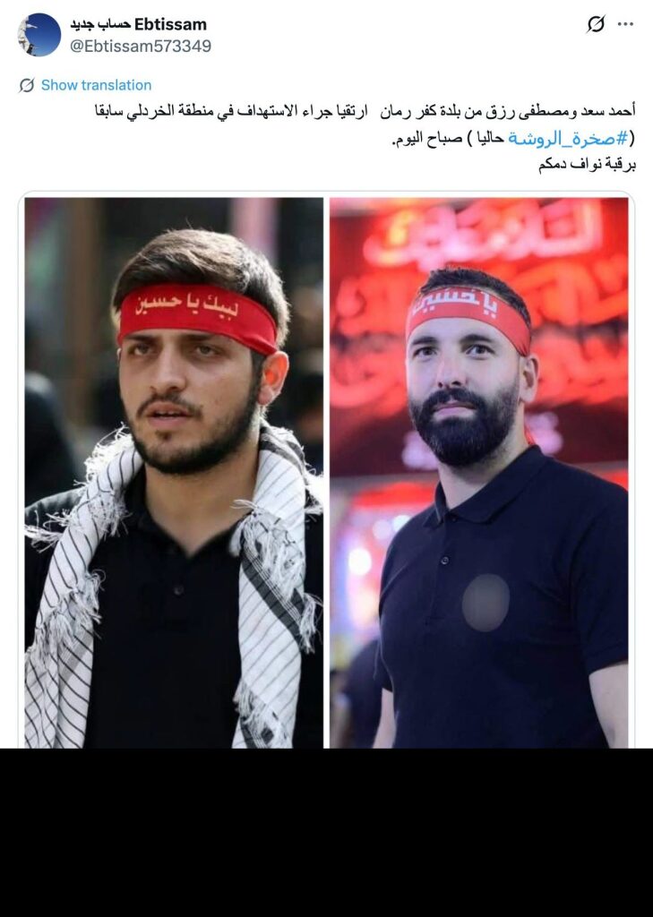 Ahmad Saad and Mustafa Rizk, from the town of Kafr Rumman, were killed in the attack in the Khardali area (formerly known as #Rawsha_Rock) this morning.