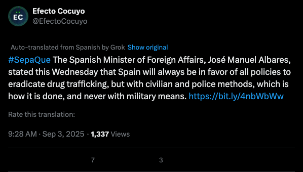 #SepaQue The Spanish Minister of Foreign Affairs, José Manuel Albares, stated this Wednesday that Spain will always be in favor of all policies to eradicate drug trafficking, but with civilian and police methods, which is how it is done, and never with military means. https://bit.ly/4nbWbWw
