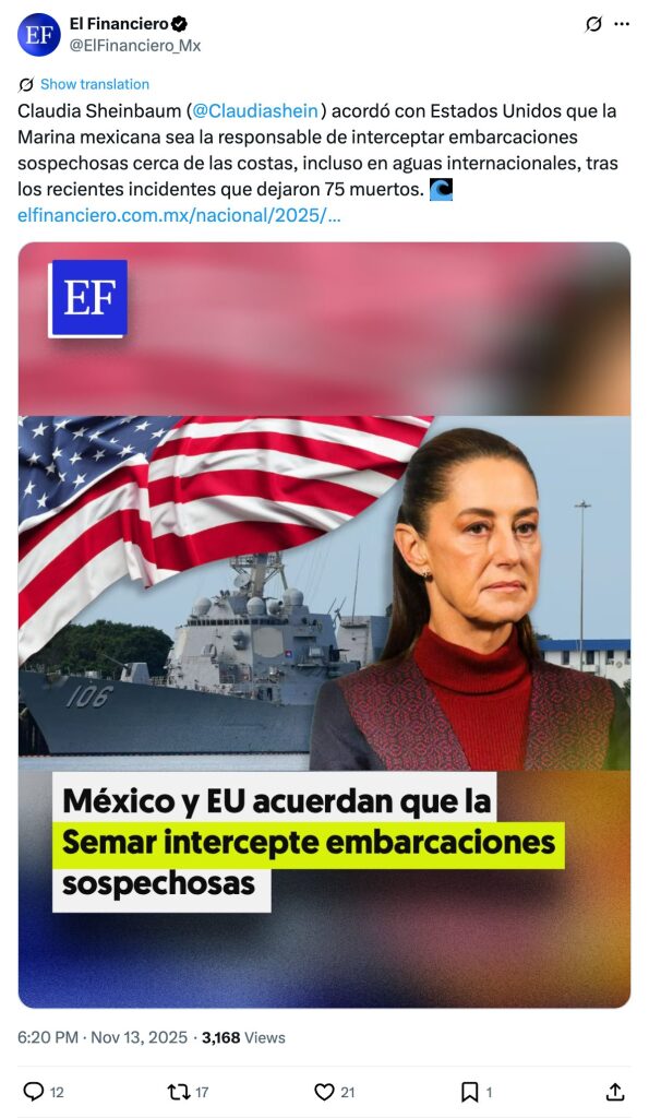Claudia Sheinbaum (@Claudiashein) reached an agreement with the United States that the Mexican Navy will be responsible for intercepting suspicious vessels near the coast, including in international waters, following the recent incidents that left 75 dead.