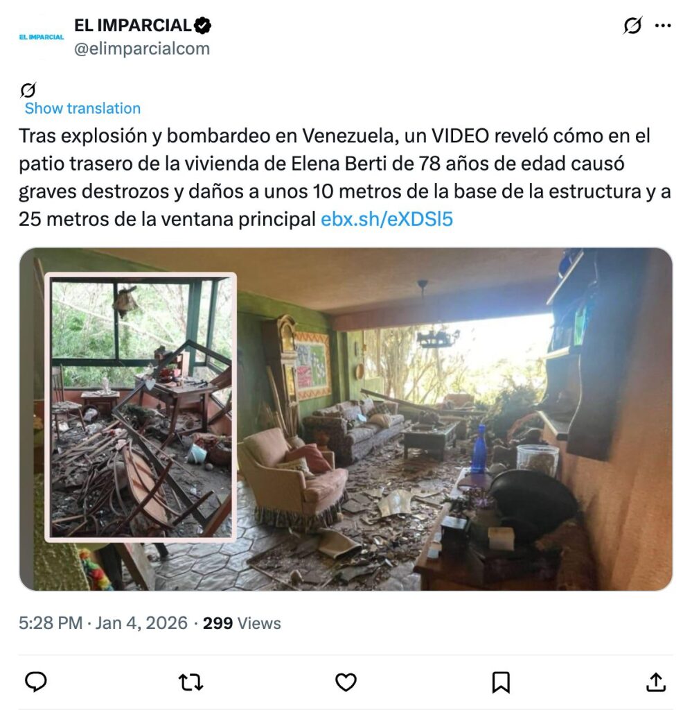 Following an explosion and bombing in Venezuela, a video revealed how the backyard of 78-year-old Elena Berti suffered severe damage, extending approximately 10 meters from the base of the structure and 25 meters from the main window. https://ebx.sh/eXDSl5