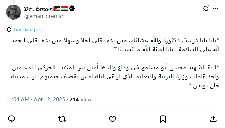 *Dad, dad, I studied for a doctorate for you, by God, who will say welcome? Who will say thank God you are safe? Dad, please don't leave us.* *The daughter of the martyr Mohsen Abu Musameh bids farewell to her father, the Secretary of the Teachers' Movement Office and one of the figures in the Ministry of Education, who was martyred last night when their tent was bombed west of Khan Yunis.*