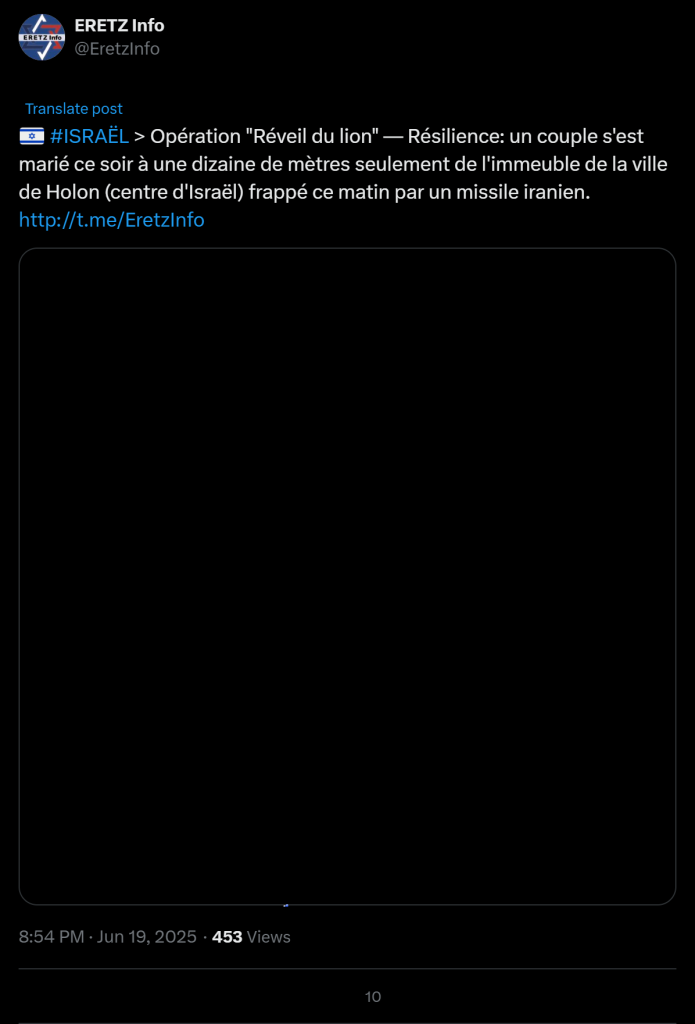 #ISRAEL > Operation "Lion's Awakening" — Resilience: A couple got married this evening just ten meters from the building in the city of Holon (central Israel) hit this morning by an Iranian missile. http://t.me/EretzInfo