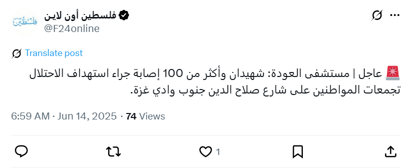 Urgent | Al-Awda Hospital: Two martyrs and more than 100 injured as the occupation forces targeted civilian gatherings on Salah al-Din Street, south of Wadi Gaza.