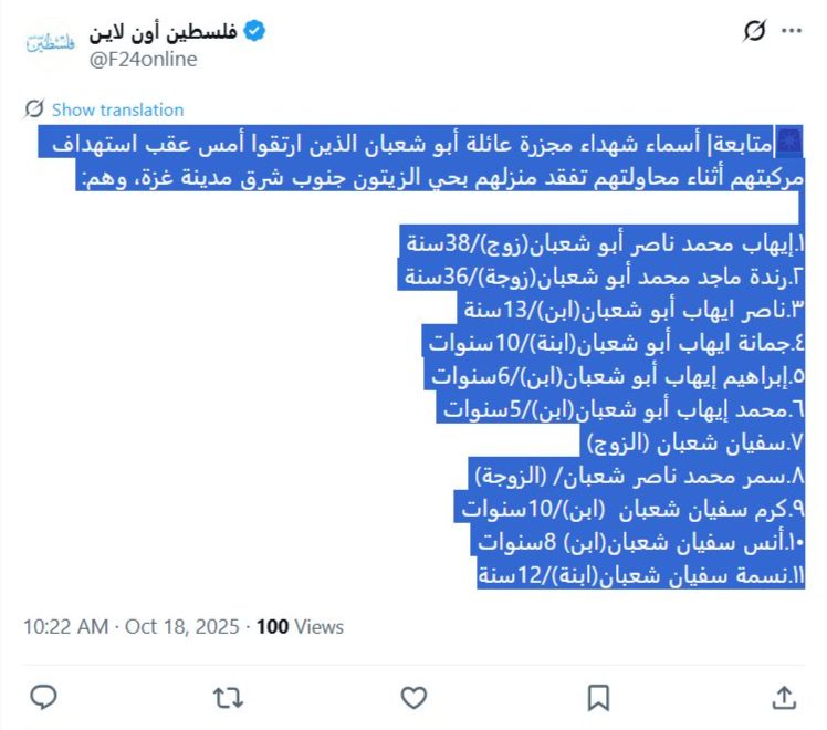Follow-up | The names of the martyrs of the Abu Shaaban family massacre, who were killed yesterday after their vehicle was targeted while they were trying to check on their home in the Zeitoun neighborhood, southeast of Gaza City, are: