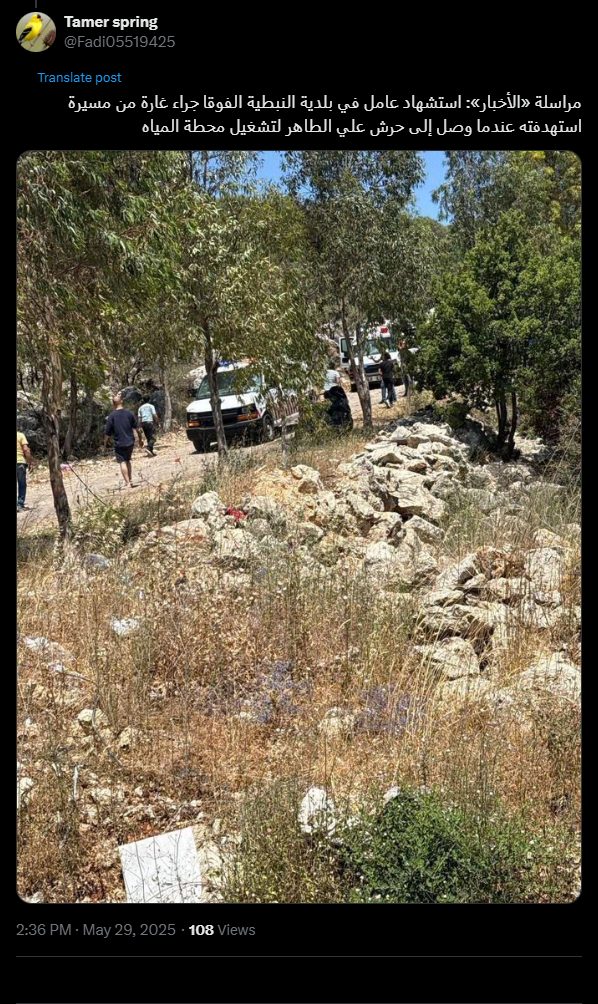 مراسلة «الأخبار»: استشهاد عامل في بلدية النبطية الفوقا جراء غارة من مسيرة استهدفته عندما وصل إلى حرش علي الطاهر لتشغيل محطة المياه