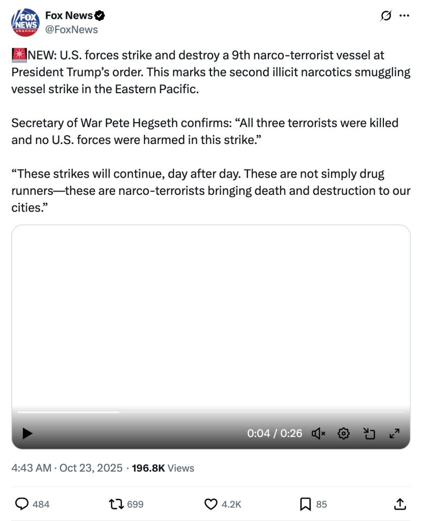 Archive URL: https://airwars.org/source/x-com-foxnews-1981310528216539326-2025-10-23-104335/