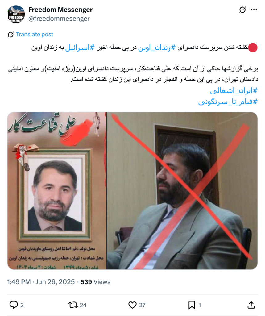 کشته شدن سرپرست دادسرای #زندان_اوین در پی حمله اخیر #اسرائیل به زندان اوین