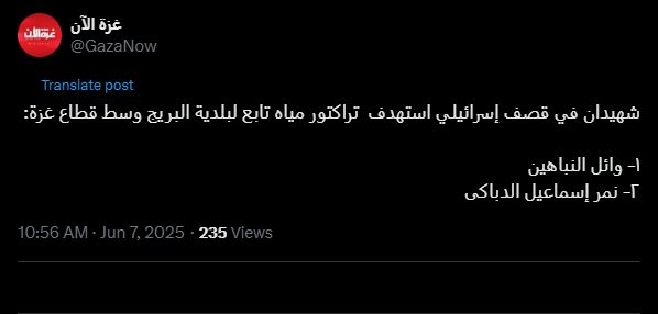 Two martyrs in an Israeli airstrike targeting a water tractor belonging to the Bureij Municipality in the central Gaza Strip: