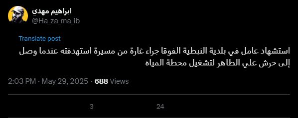 استشهاد عامل في بلدية النبطية الفوقا جراء غارة من مسيرة استهدفته عندما وصل إلى حرش علي الطاهر لتشغيل محطة المياه