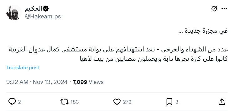 In a new massacre... a number of martyrs and wounded - after they were targeted at the western gate of Kamal Adwan Hospital. They were on a cart pulled by an animal and carrying wounded people from Beit Lahia.