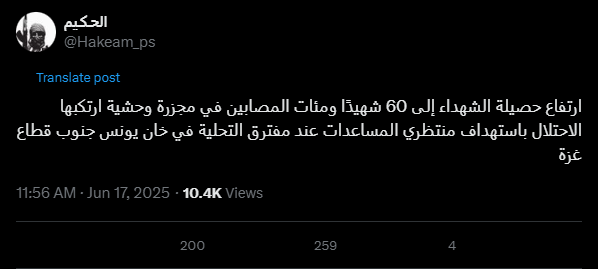 ارتفاع حصيلة الشهداء إلى 60 شهيدًا ومئات المصابين في مجزرة وحشية ارتكبها الاحتلال باستهداف منتظري المساعدات عند مفترق التحلية في خان يونس جنوب قطاع غزة